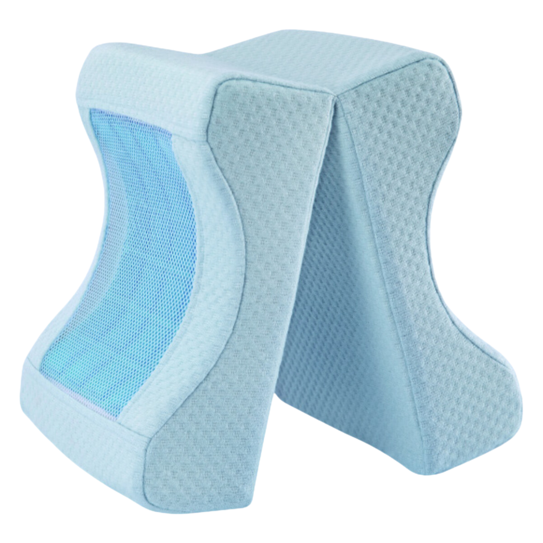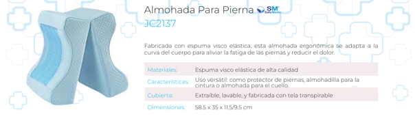 Especialmente diseñada para colocarse entre las rodillas, esta almohada alinea la cadera, pelvis y columna. Reduce la presión en la zona lumbar y previene la rotación de la cadera, siendo ideal para quienes duermen de lado y para la recuperación postoperatoria.