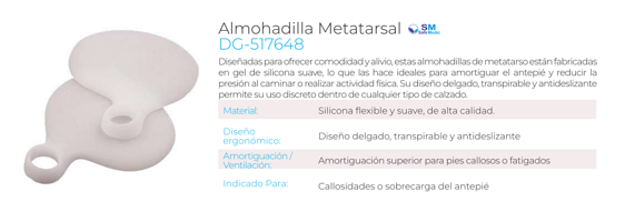 Pequeña almohadilla que se coloca debajo de la parte delantera del pie. Ayuda a aliviar el dolor en la zona de los metatarsos (metatarsalgia) al distribuir la presión.