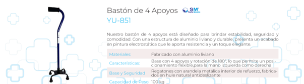 Su base ancha con cuatro puntos de contacto ofrece una estabilidad significativamente mayor que un bastón estándar. Es ideal para usuarios que requieren un nivel superior de apoyo y seguridad al caminar.