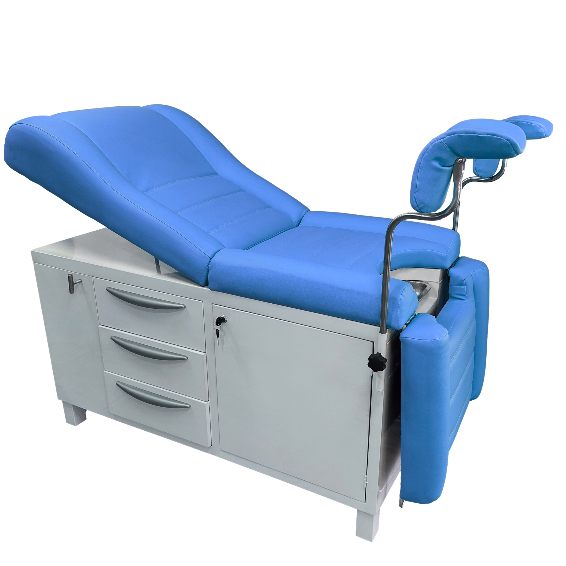 Camilla especializada con soportes para piernas (perneras) y una sección pélvica recortada. Diseñada para facilitar los exámenes y procedimientos ginecológicos de manera cómoda y eficiente.