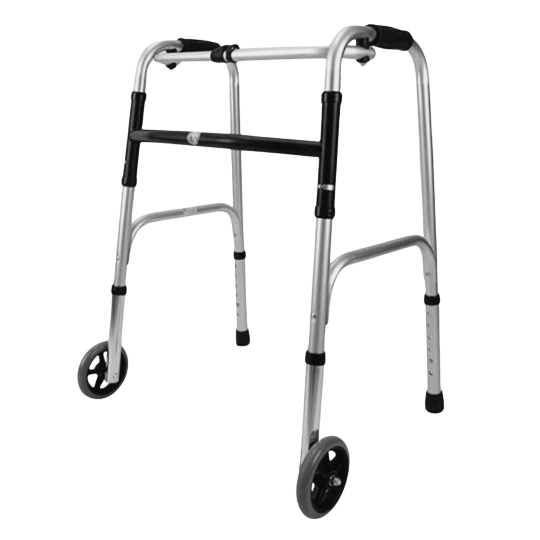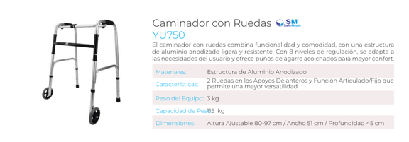 Equipado con ruedas delanteras, este caminador permite un desplazamiento más fluido y rápido sin necesidad de levantarlo. El usuario simplemente lo empuja hacia adelante. Las patas traseras sin ruedas actúan como freno.