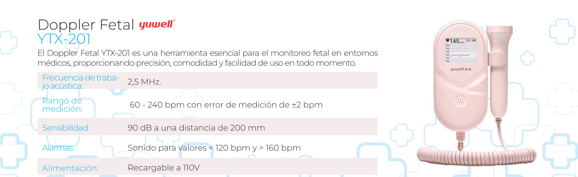 Un modelo de doppler fetal compacto y de alta sensibilidad. Su pantalla LCD muestra la frecuencia cardíaca fetal, proporcionando una medición cuantitativa además del sonido.