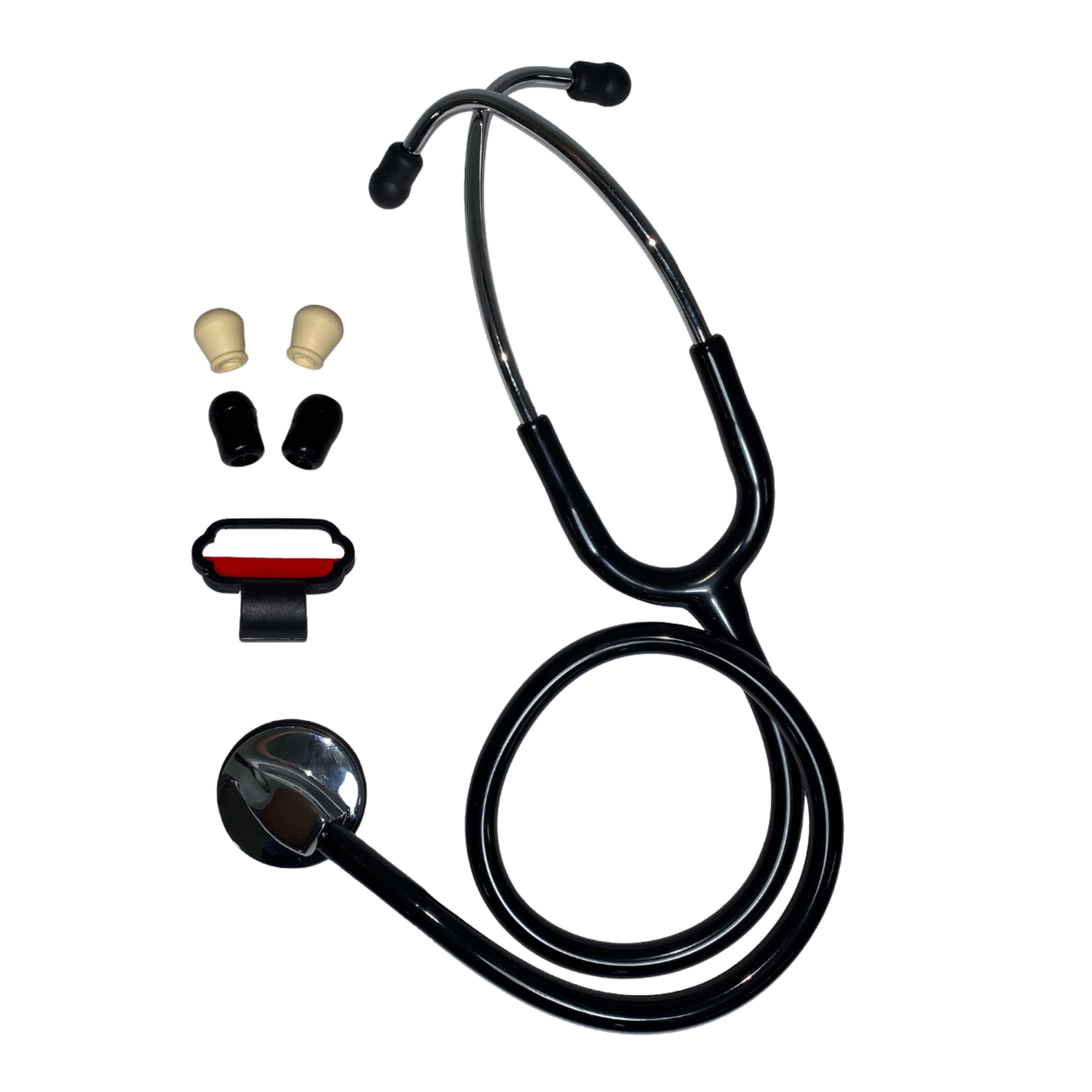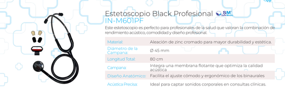Un estetoscopio de alta gama con una acústica superior y un diseño elegante en color negro. Ideal para profesionales que requieren la máxima claridad en la auscultación.