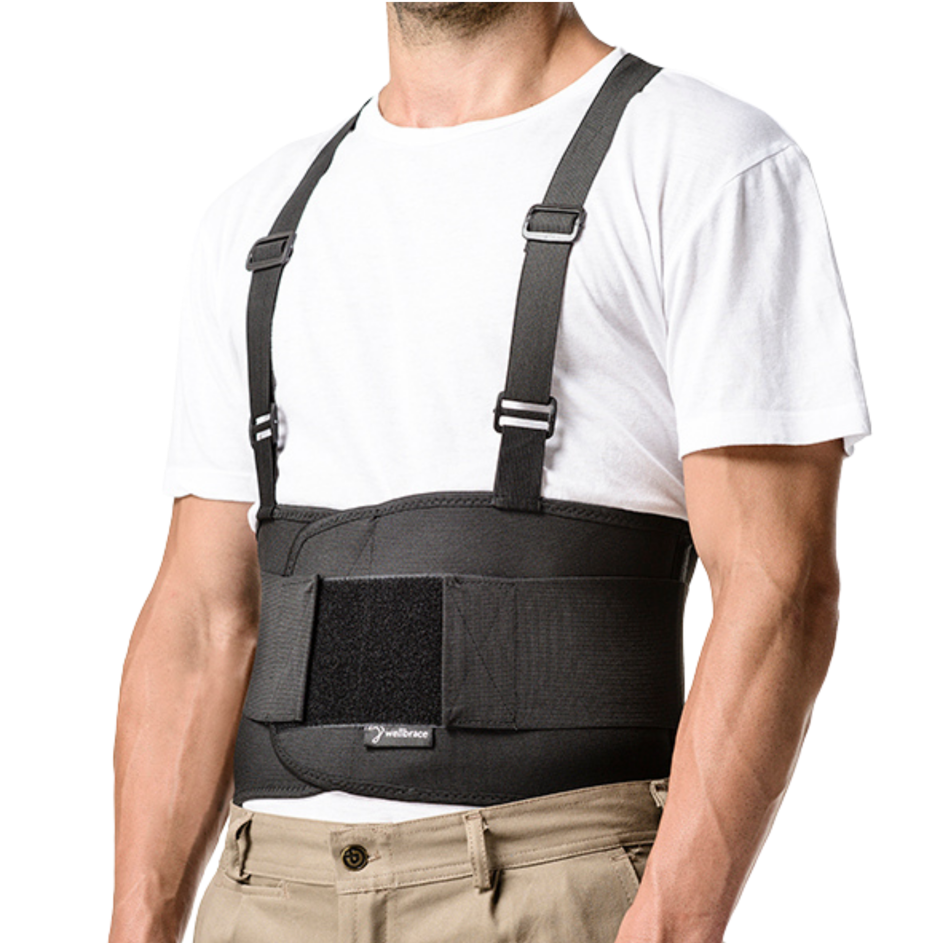 Faja lumbar de soporte, a menudo con tirantes, diseñada para ser usada durante el levantamiento de cargas pesadas. Ayuda a mantener una postura correcta y a prevenir lesiones de espalda.