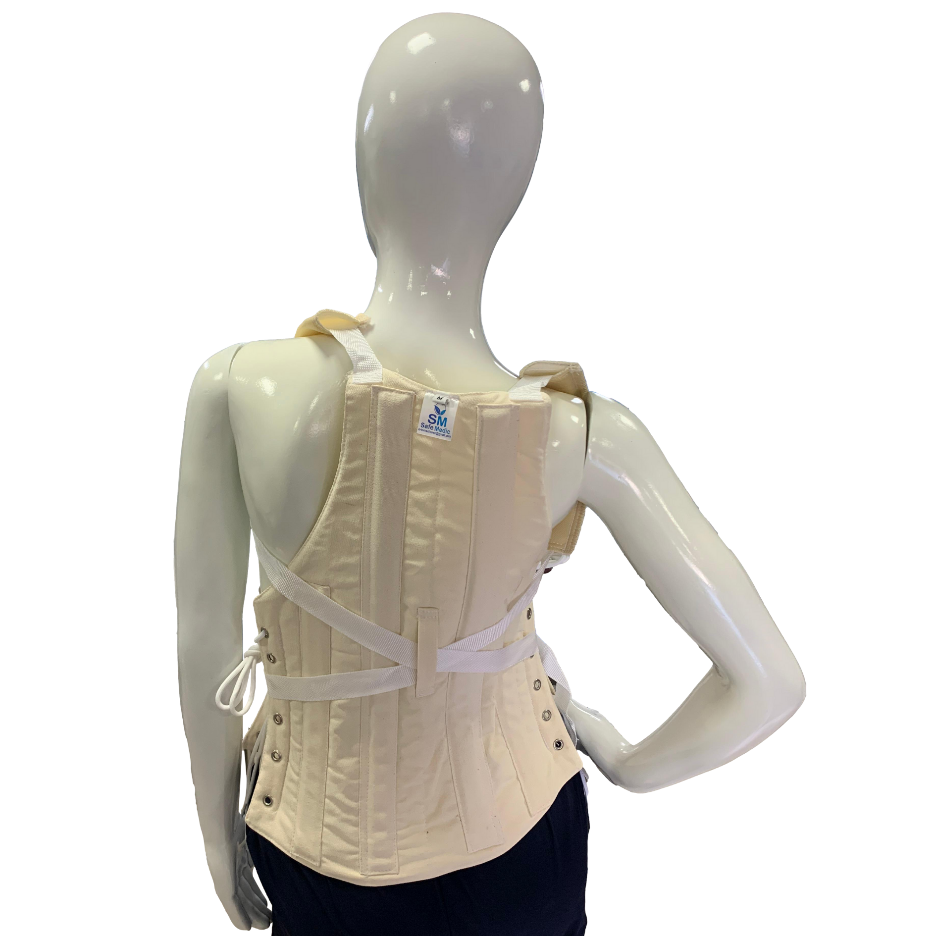 La faja de soporte más completa, con ballenas que recorren tanto la zona lumbar como la dorsal. Proporciona una inmovilización y un soporte máximos para lesiones o patologías severas.