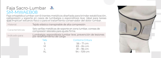 Faja centrada en dar soporte a la parte baja de la espalda (articulación sacroilíaca y columna lumbar). Ideal para lumbalgias, ciática y debilidad muscular.