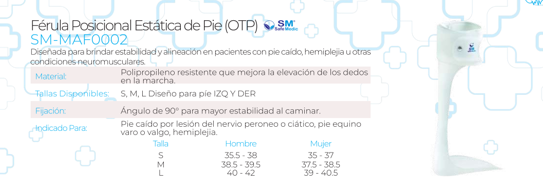 Órtesis Tobillo-Pie (OTP o AFO en inglés) que mantiene el pie y el tobillo en una posición funcional. Se utiliza para controlar el pie caído o la inestabilidad en pacientes con secuelas neurológicas.
