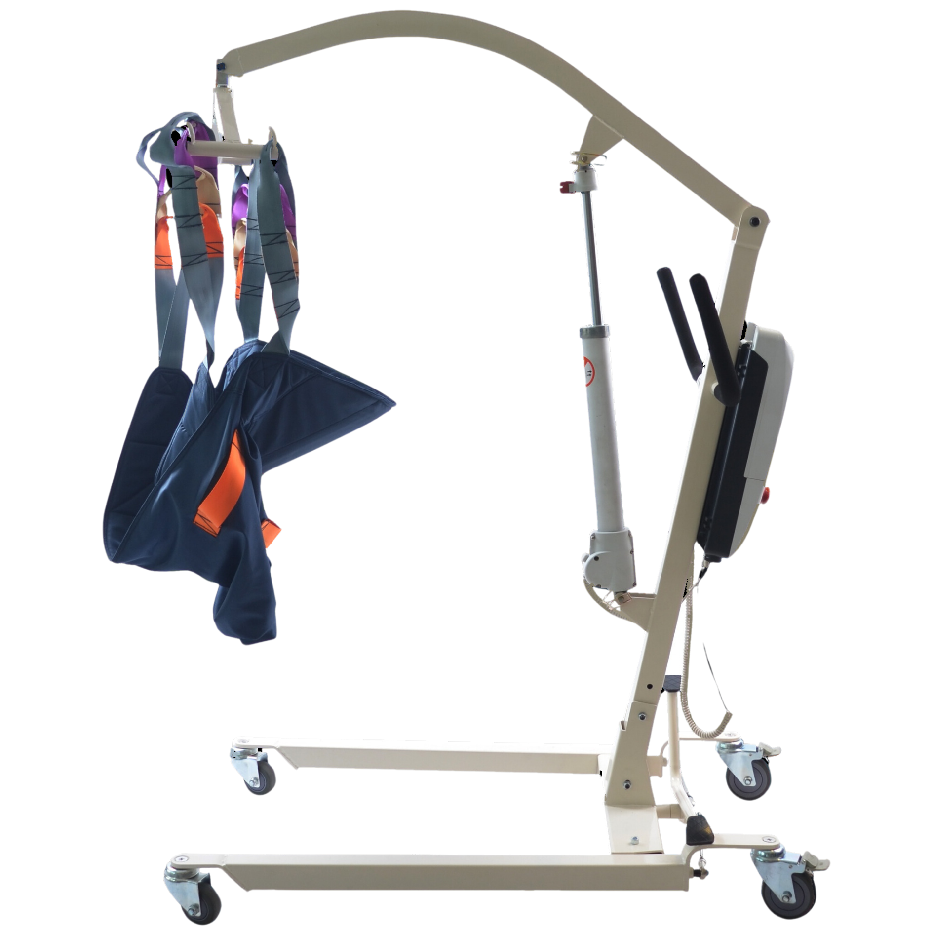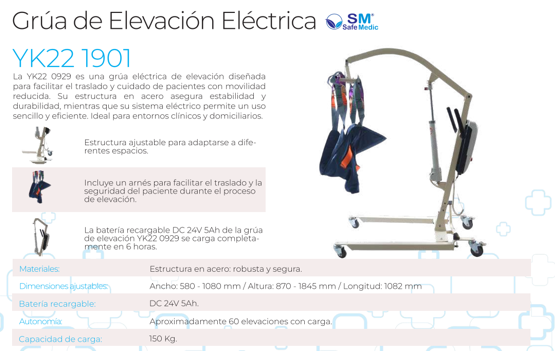 Grúa eléctrica para pacientes que utiliza un motor para elevar al usuario mediante un arnés. Facilita enormemente las transferencias, protegiendo la espalda del cuidador y garantizando la seguridad del paciente.