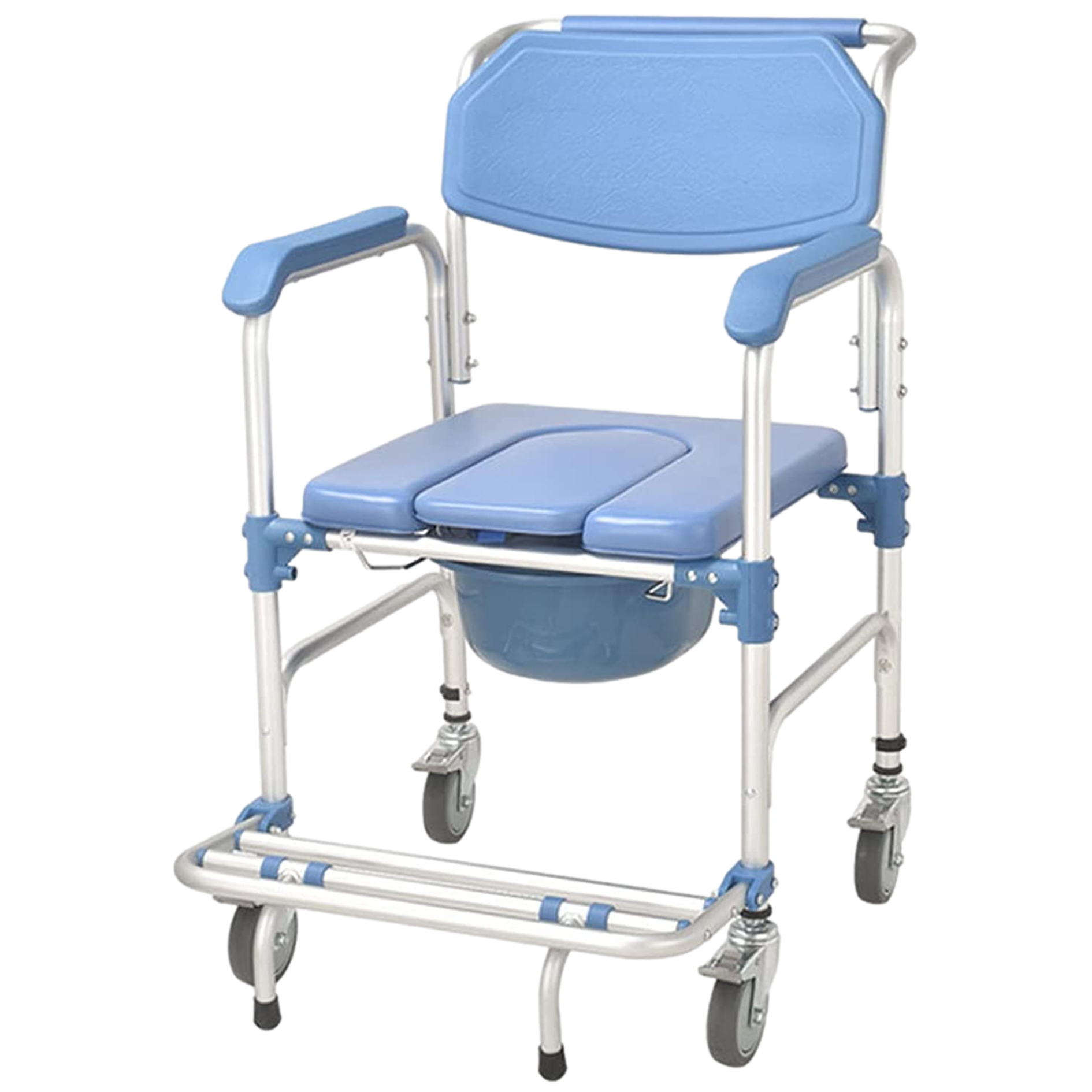 Silla cómoda con inodoro incorporado y ruedas. Se puede usar junto a la cama y también para trasladar al paciente hasta el cuarto de baño, donde puede colocarse directamente sobre el inodoro.
