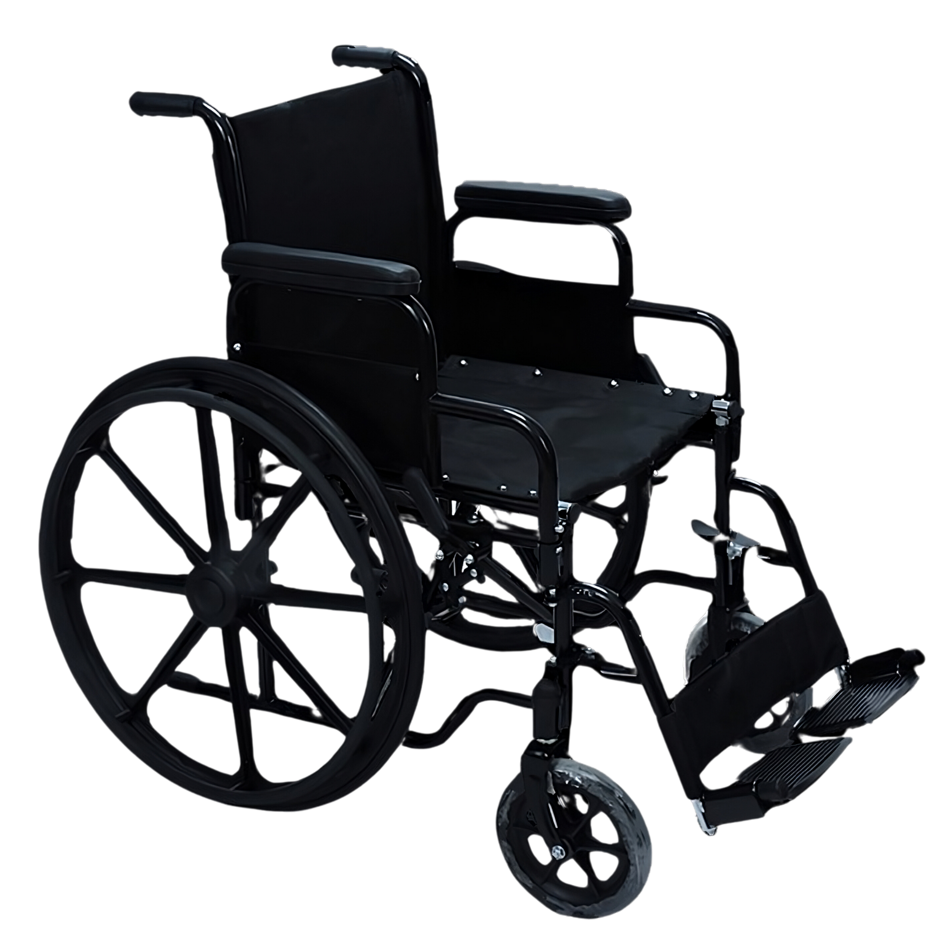 Esta silla permite retirar los reposapiés, lo que facilita las transferencias laterales del usuario (por ejemplo, a una cama o al coche). Las ruedas sólidas no requieren mantenimiento.