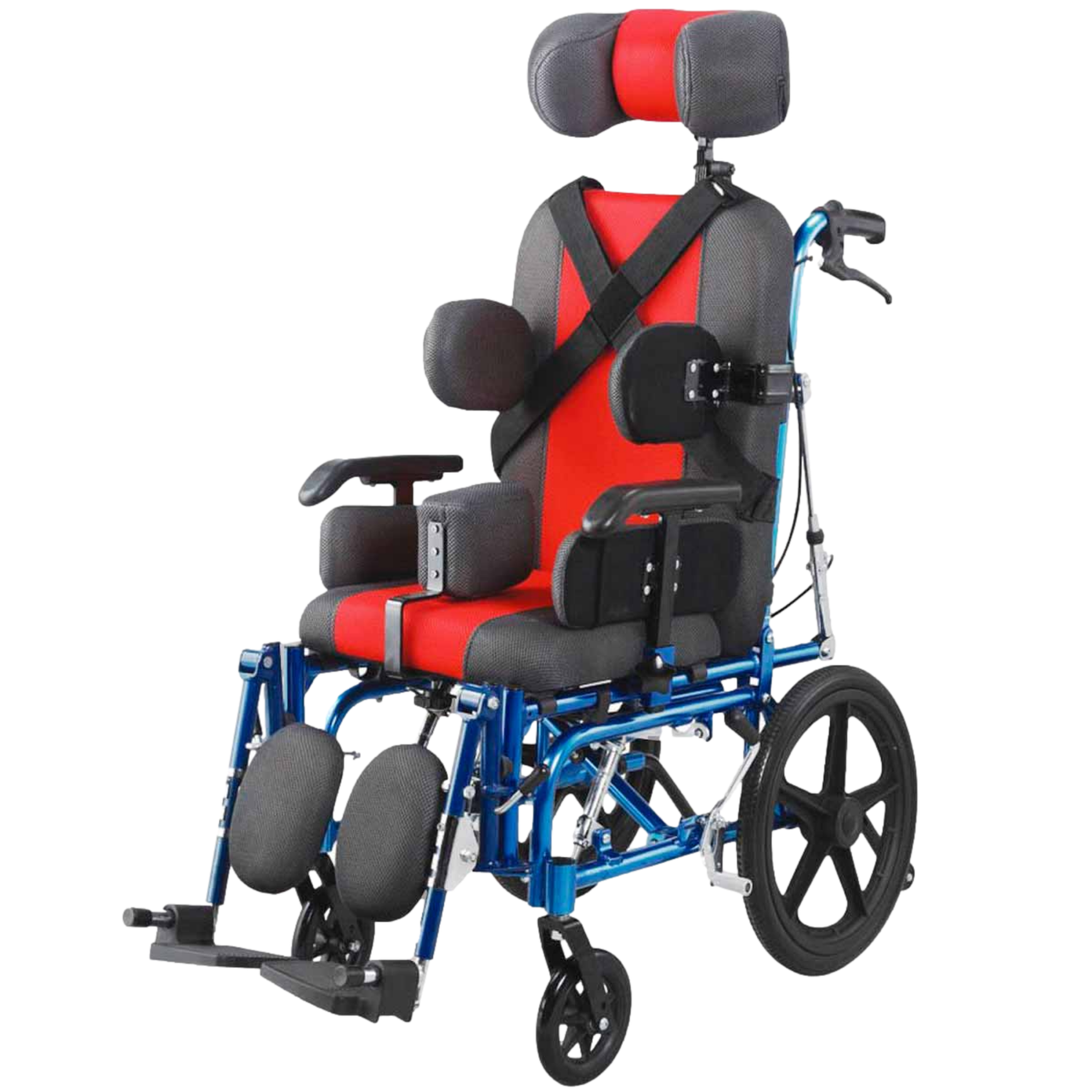 Silla de ruedas para niños que ofrece un soporte postural completo y personalizable. Incluye soportes para la cabeza, tronco y pelvis para garantizar una correcta alineación y prevenir deformidades.
